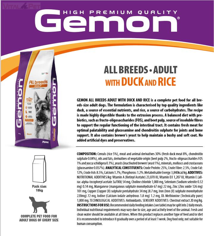 Olaszországban készült prémium kutyatáp A GEMON FELNŐTT KUTYATÁP KACSA ÉS RIZZSEL egy teljes értékű állateledel minden fajtájú,